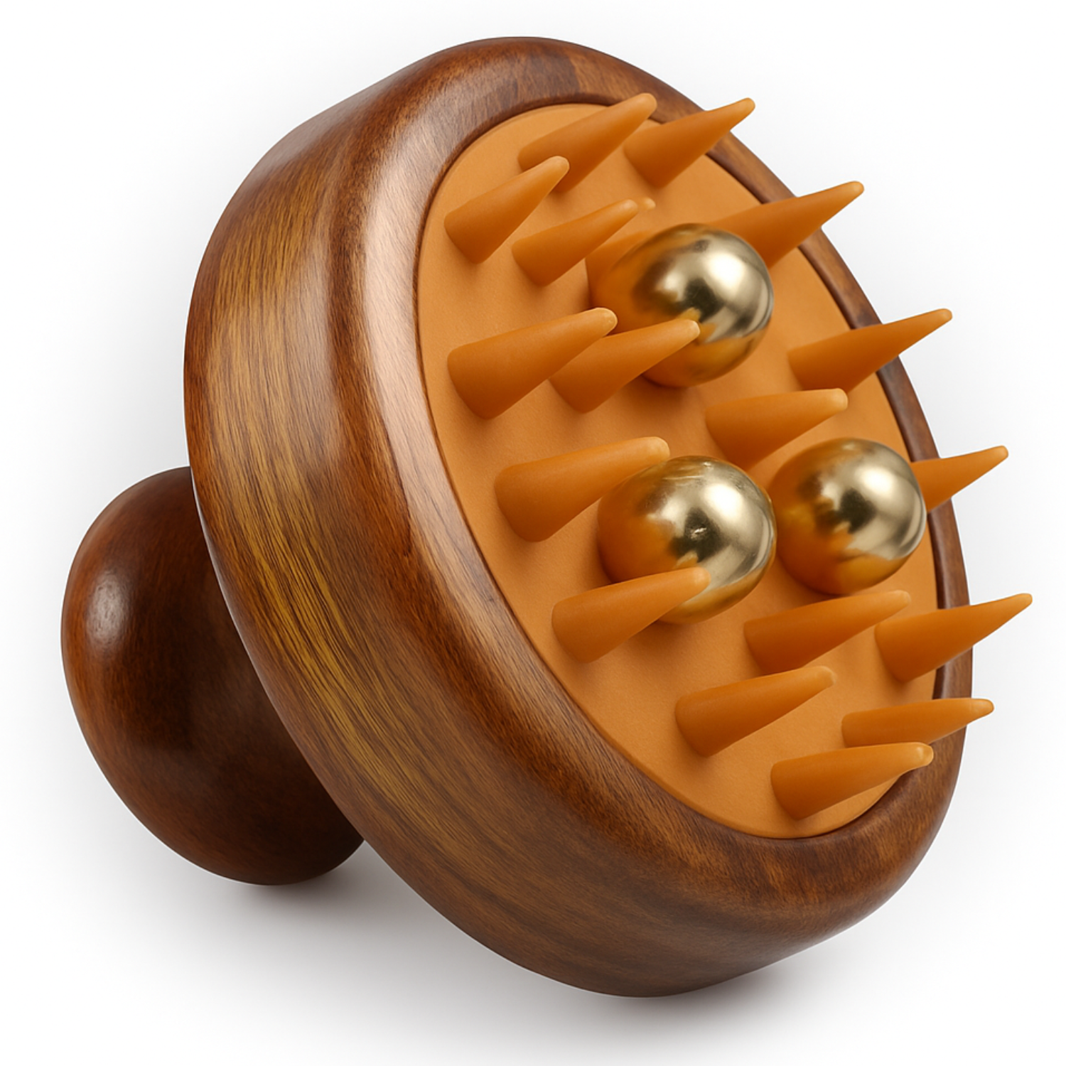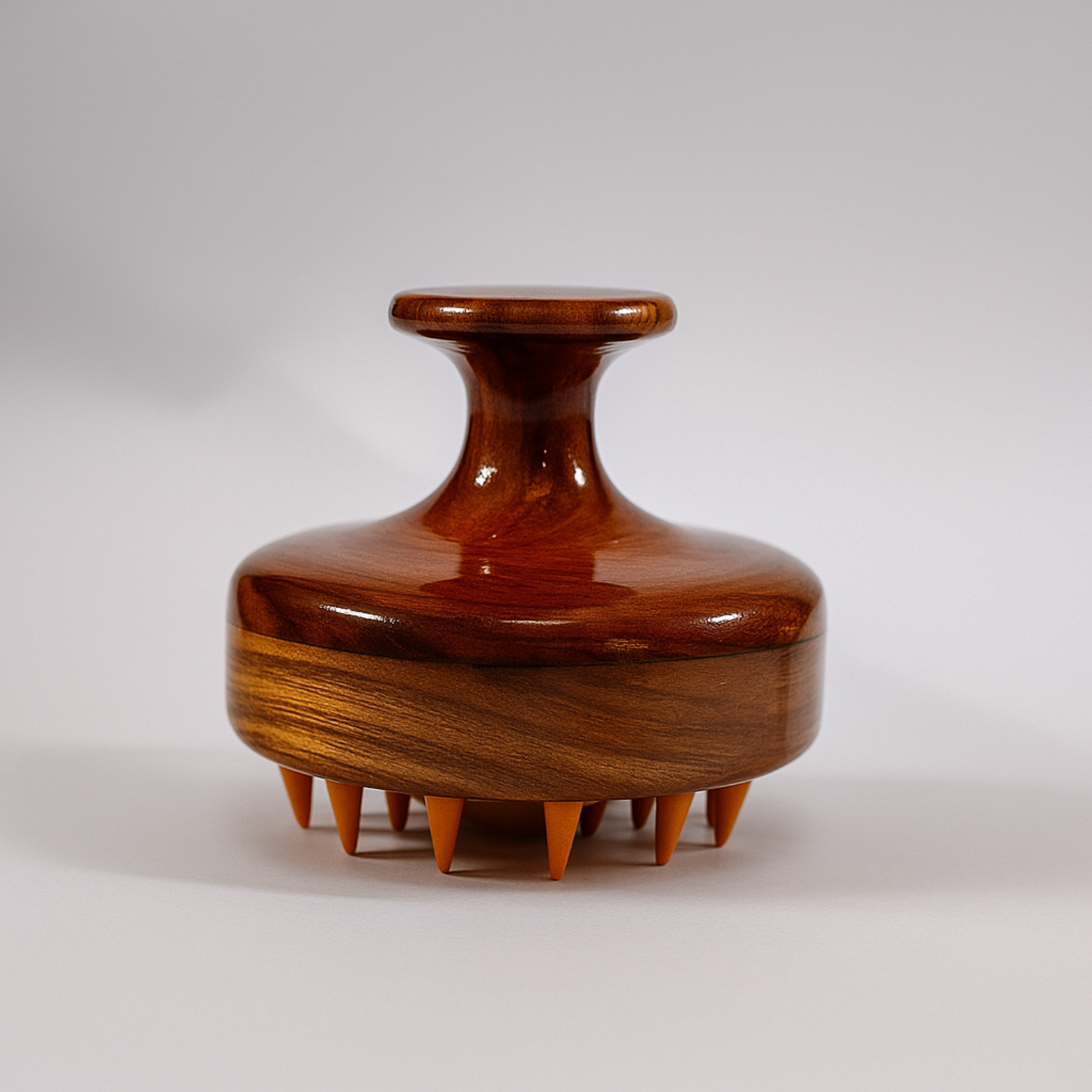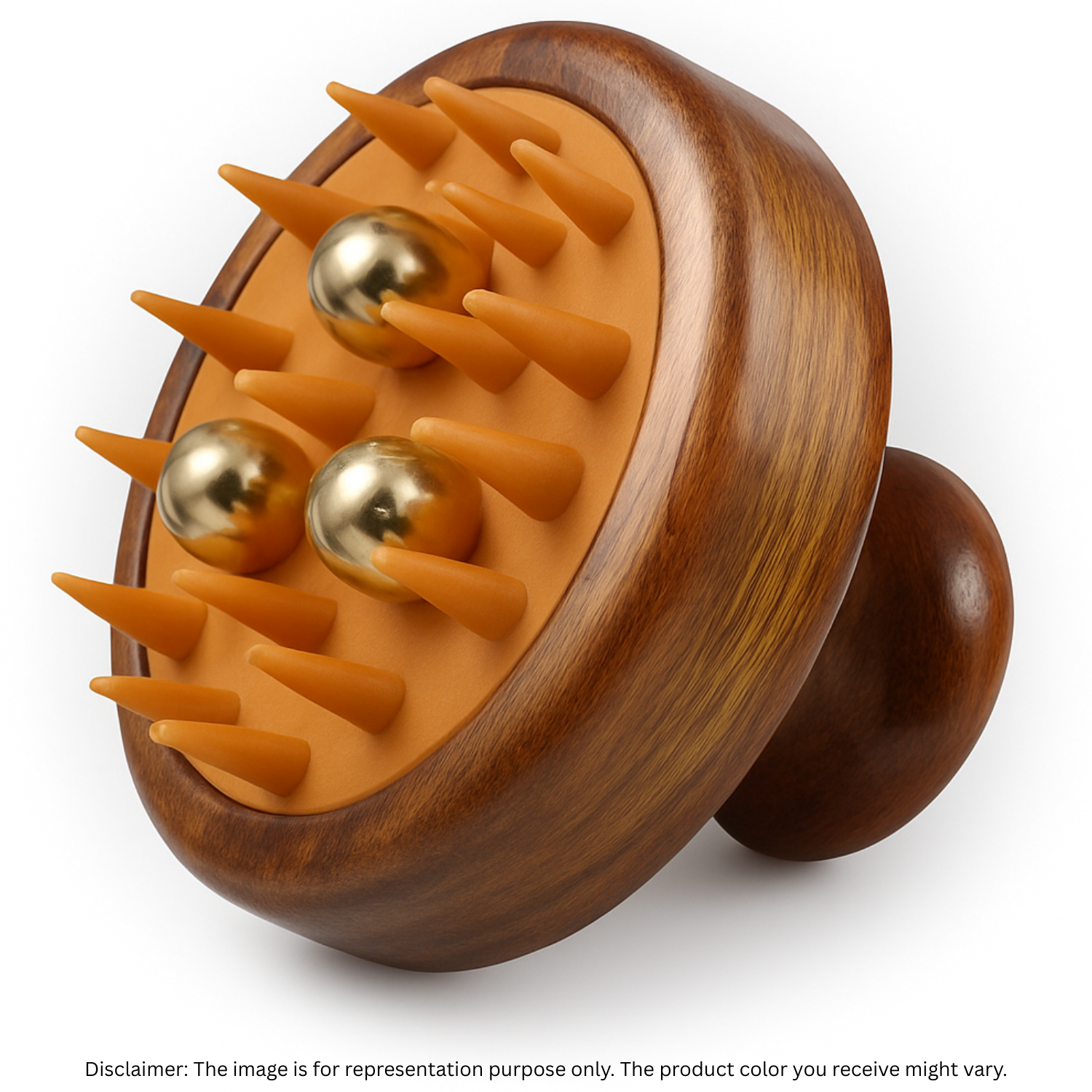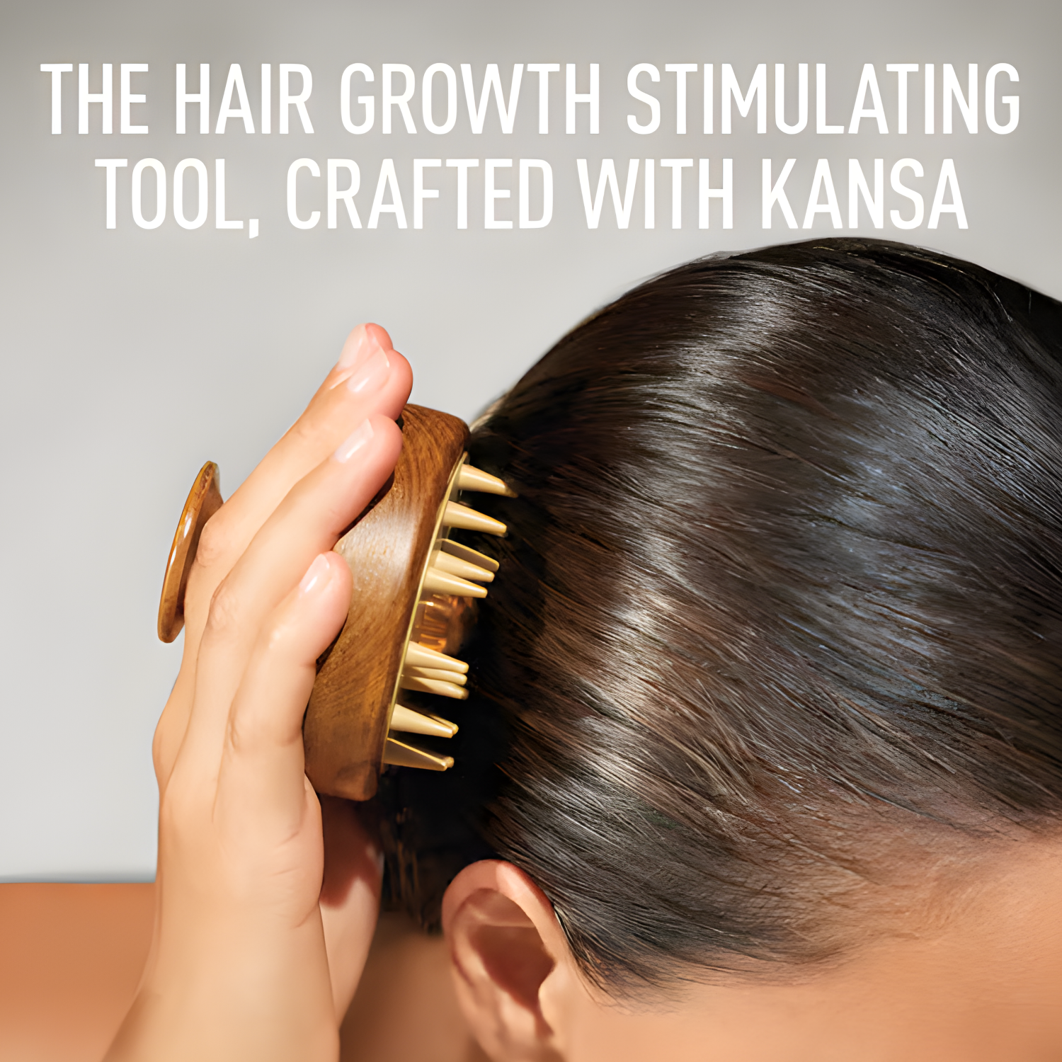 AYURVEDIC KANSA SCALP MASSAGE BRUSH: Crafted with a sacred Kansa (copper + tin) dome and soft elastomer bristles to stimulate scalp energy points and promote holistic hair wellness.
