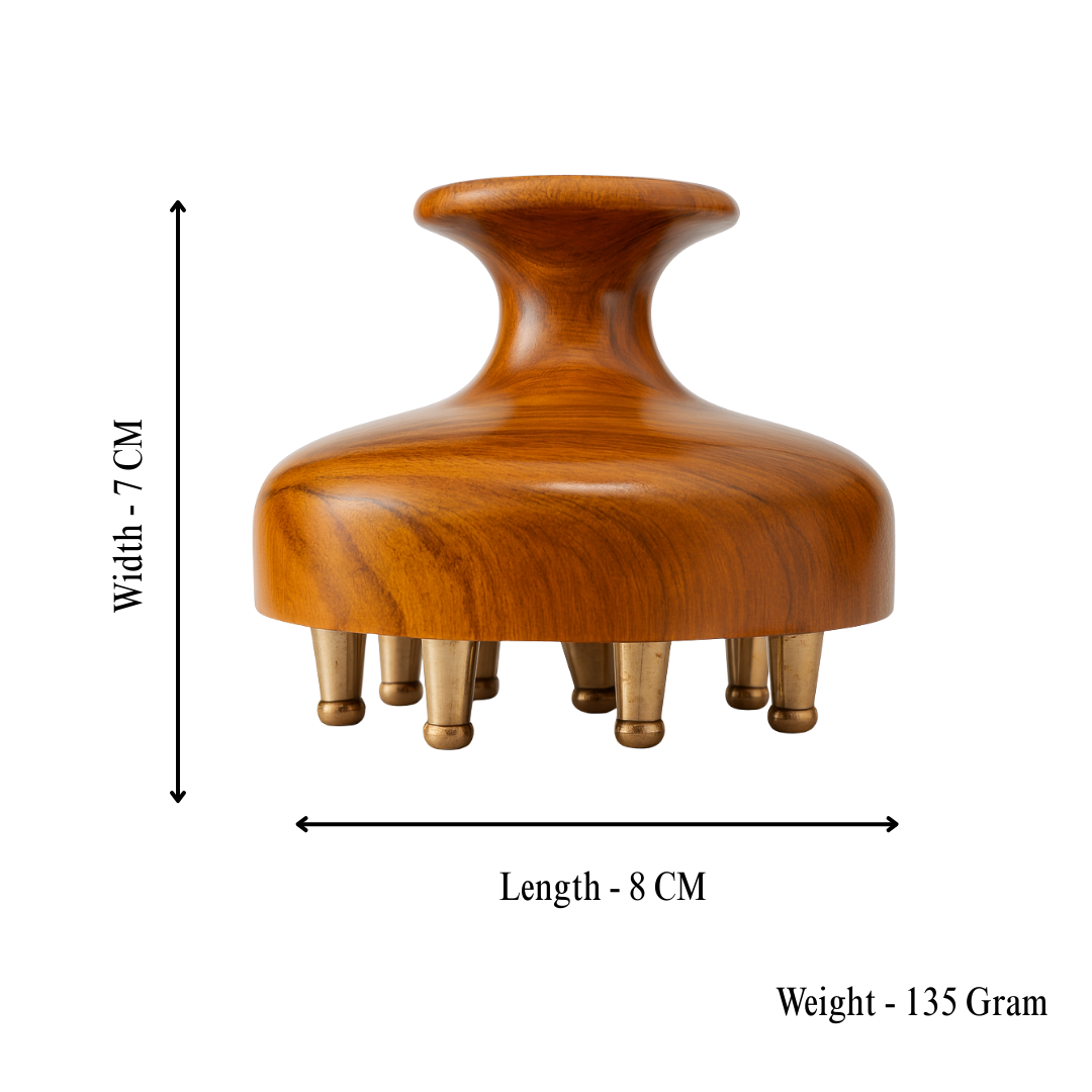 Revitalize your hair, skin, and mind with the Casaveda® Kansa Scalp & Body Massager, a premium Ayurvedic tool handcrafted from pure Kansa (copper–tin alloy) and sustainably sourced teak wood. Designed to activate Marma (energy) points, this massager enhances scalp circulation, supports hair growth, relieves muscle tension, and boosts overall well-being. The Kansa prongs mimic the gentle pressure of fingertip massage, helping release tightness in the scalp, temples, neck, and shoulders. When used with hair oils like onion oil, rosemary oil, or bhringraj oil, it enhances absorption and strengthens hair follicles. For the body, it promotes lymphatic drainage, detoxification, and a deep sense of relaxation. Each piece is handmade, giving every massager a unique and artisanal touch. Lightweight, durable, and easy to use, it is the perfect companion for daily haircare rituals, stress relief sessions, and holistic self-care practices.
